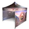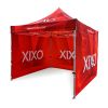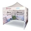 Reclame tenten met digitale sublimatieprint. Het printen gebeurt via een chemisch proces waarbij de inkt onder invloed van hoge temperatuur direct in de structuur van de stof doordringt. Logo, tekst of welk type grafiek dan ook aan de binnen- of buitenkant van de tent, volgens de wensen van de klant.