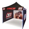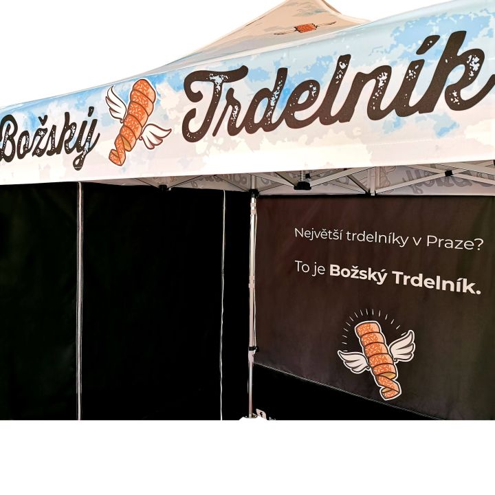 Reclame tenten met digitale sublimatieprint. Het printen gebeurt via een chemisch proces waarbij de inkt onder invloed van hoge temperatuur direct in de structuur van de stof doordringt. Logo, tekst of welk type grafiek dan ook aan de binnen- of buitenkant van de tent, volgens de wensen van de klant.